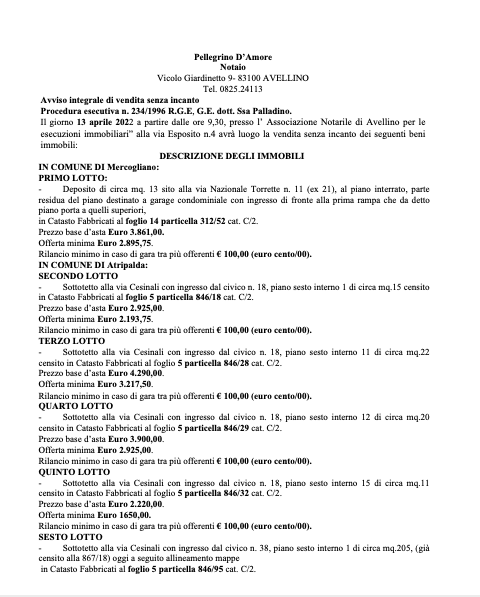 | Esecuzione immobiliare n. 234/96 R.G.E. del Tribunale di Avellino Notaio delegato: Pellegrino D'Amore |