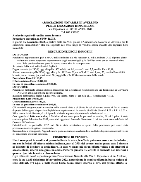 | Esecuzione immobiliare n. 66/99 R.G.E. del Tribunale di Avellino Notaio delegato: Pellegrino D'Amore |