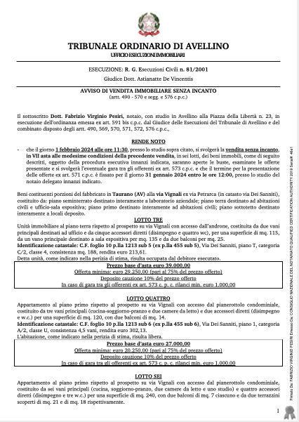 | Esecuzione immobiliare n. 81/01 R.G.E. del Tribunale di Avellino Notaio delegato: Fabrizio Virginio Pesiri |